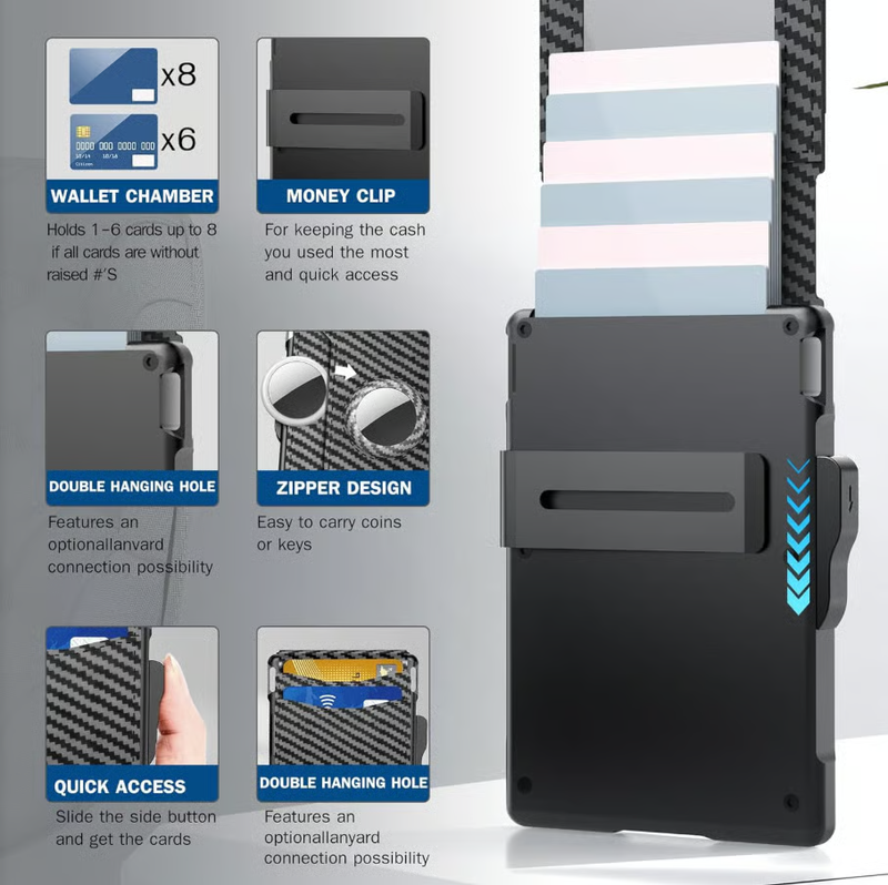 【MINIMALIST WALLET 】: We have chosen high quality materials for the wallet cover. Handmade high quality leather + carbon fiber texture.. The aluminum wallet chamber make of premium metal with a smooth eject pop up feature, using the latest ergonomic design, easy slide the side button of the metal wallet and get the neat pop-up cards.