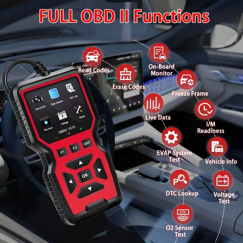 Professional OBD2 Diagnostic Scanner for Cars — Reads Vehicle Codes, Clears Fault Codes, 35901 Trouble Code Library, Real-Time Data Stream, Oxygen Sensor Tester, Battery Voltage Reading, 6-8 Mode Detection
